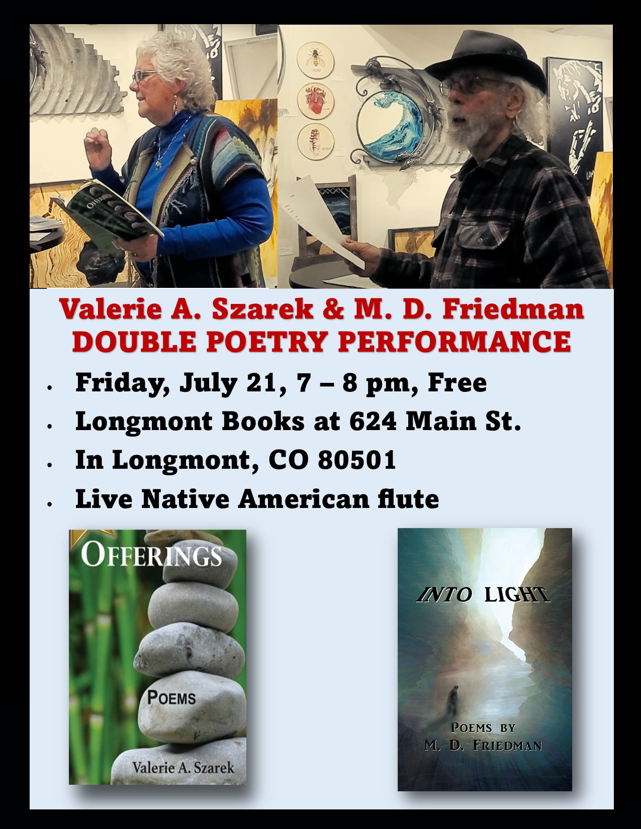 Valerie A. Szarek & M. D. Friedman will be reading from their new poetry books. There will be live musical interludes with pleanty of improvisational Native American flute music woven in. No cover charge. Books will be available for purchase and authors will be happy to sign. Please join us at this historical event to hear two of Colorado finest poets share their latest manuscripts.
